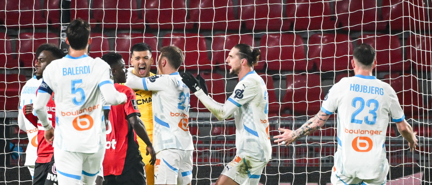 Rulli viert zijn redding op de strafschop van Stade Rennes met zijn ploeggenoten.